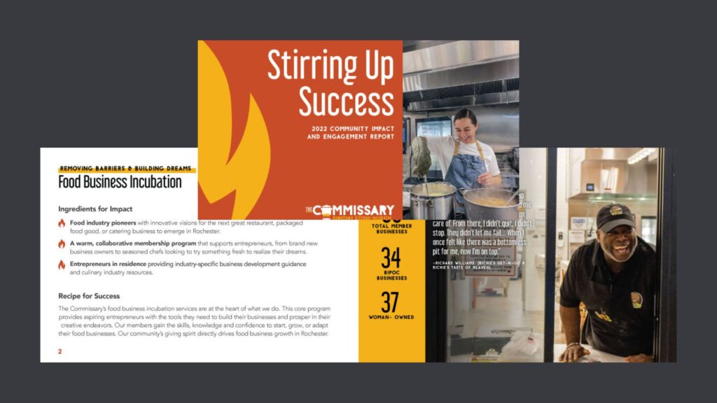The Commissary of Western NY serves aspiring food entrepreneurs from BIPOC, immigrant, low-income, and other marginalized communities who often face barriers to starting and growing businesses. Many possess rich culinary skills but lack access to workforce education, training, commercial kitchen space, and business networks. TGW Studio worked with the Commissary to engage with the community and build a marketing strategy to increase brand awareness. From web design and social impact report development to tailored educational and workshop materials, TGW help refine Commissary’s offerings to those just starting their workforce journey.