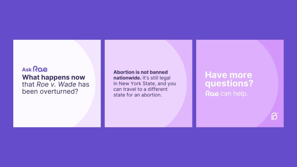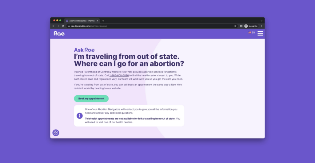 RAE (Resources for Abortion Education) is an extension of Planned Parenthood of Central and Western New York, offering comprehensive reproductive healthcare and support. TGW Studio is proud to partner with Planned Parenthood to further abortion access through an interactive, educational, easy-to-use website that answers abortion-related questions and appointment expectations. Visit raecanhelp.org today.