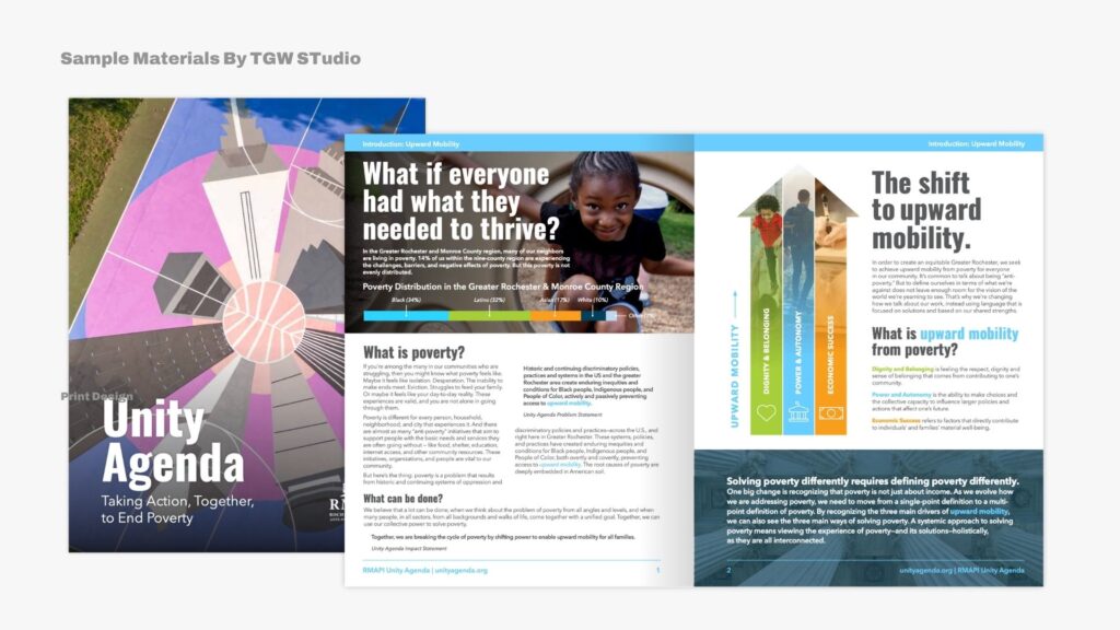 Our long standing, strategic partnership includes showcasing their momentum within community, encouraging greater involvement and ultimately changing the lives of those experiencing poverty. This recent body of work was visualized through the development of their Unity Agenda, which is their strategic plan to educate and share with the region the concept and needed steps of Upward Mobility. TGW Studio is proud to work alongside this important community initiative.