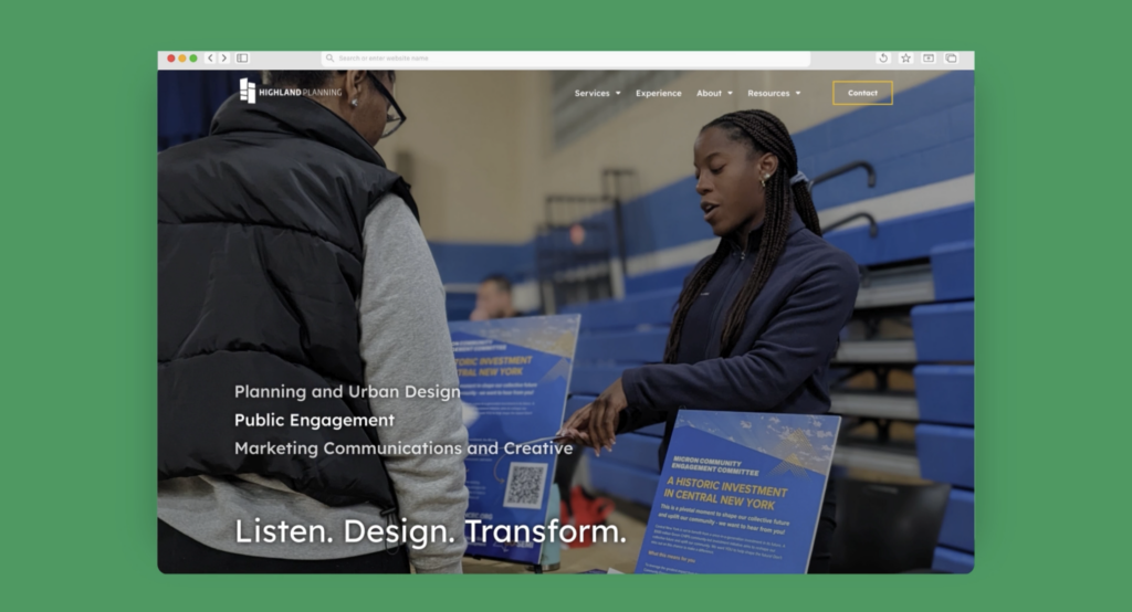 TGW Studio lead a brand refresh and website redesign for Highland Planning, an urban planning firm that collaborates with municipalities, government agencies, developers, the community, and other stakeholders to help shape and enhance the built environment in the Rochester NY area and beyond.