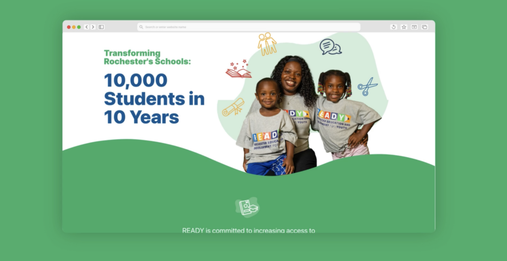 TGW Studio led a comprehensive brand refresh in partnership with the organization, “Rochester Education and Development for Youth, Inc.” (READY) to increase brand presence and raise brand awareness to potential donors and institutional partners about the organization’s dedication to quality education for youth. TGW Studio also refined READY’s digital presence with a fresh approach, improving copy and content placement to better convey READY’s goals and needs, as well as improving SEO. To elevate the overall experience, the team built a new site, ensuring improved functionality for stakeholders and potential funders.